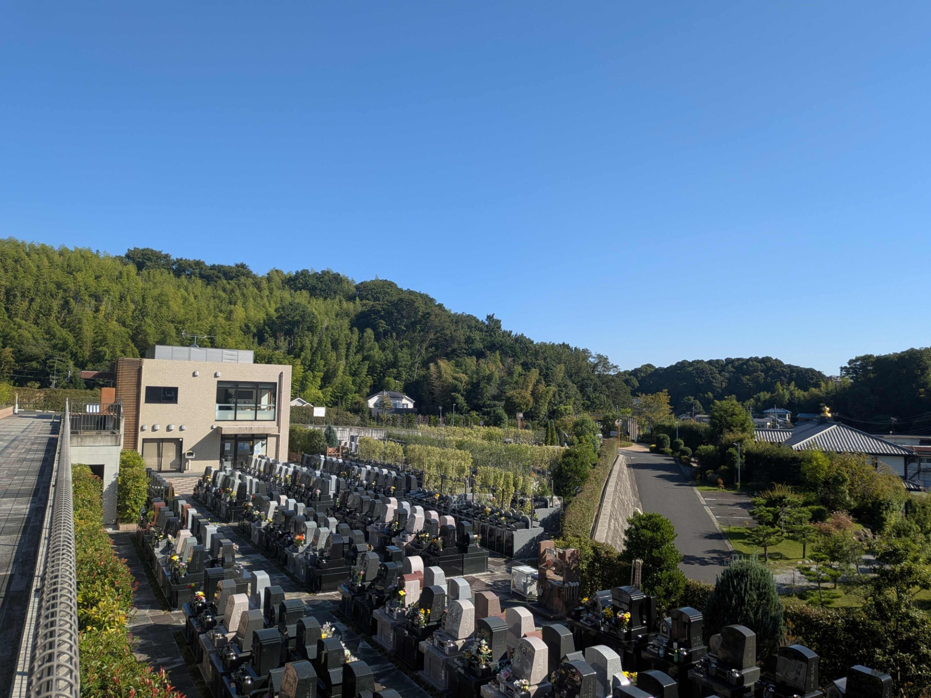 霊苑は、日常の喧騒から離れた静かな場所です。この静寂の中で、故人を思い出したり、自分の心と向き合ったりすることができます。秋の柔らかな光が差し込み、心が穏やかにリセットされるかのようです。