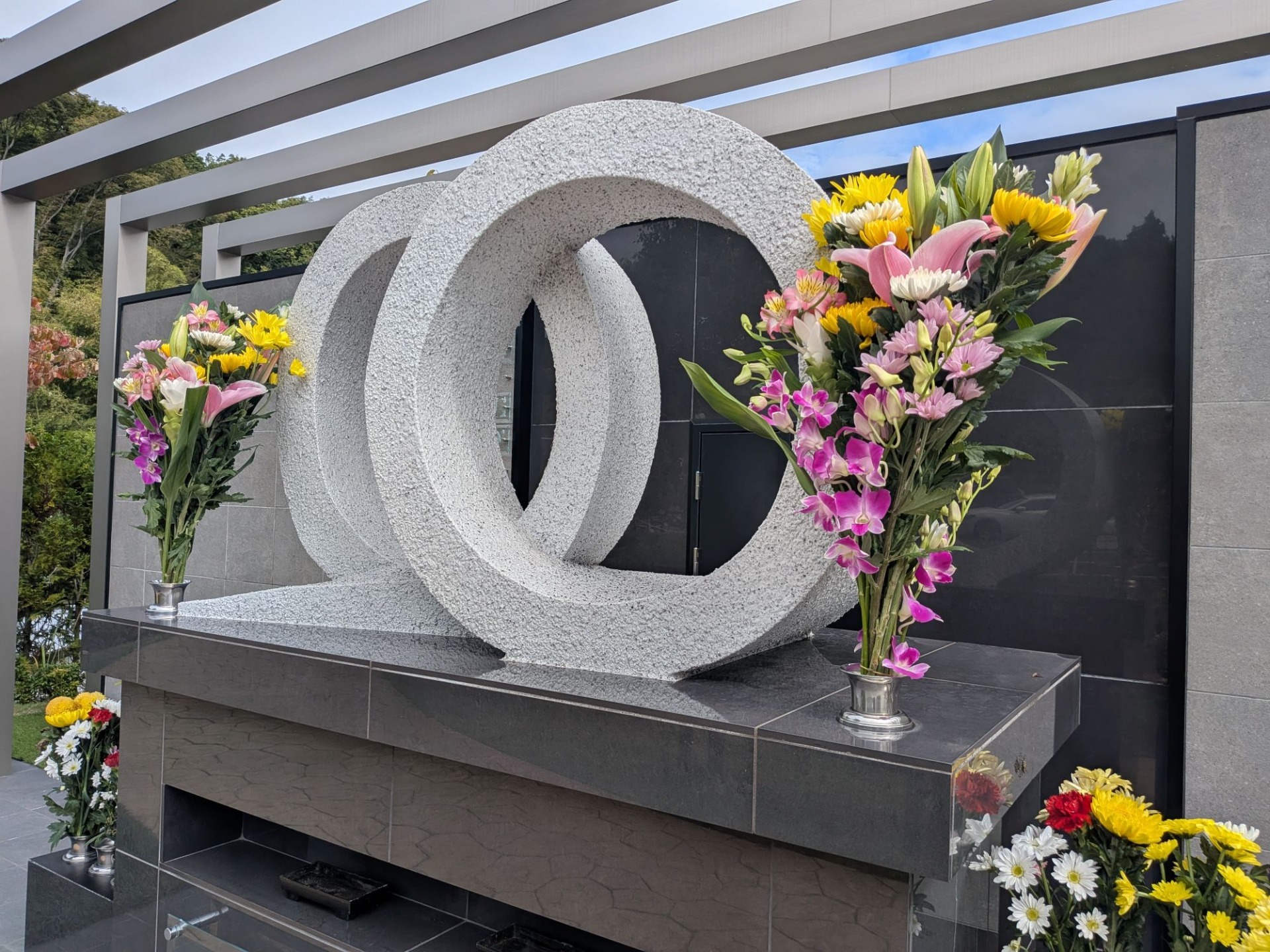 墓所、中央にあるモニュメントは、2つの丸い円形をしており、命のつながりを意味しています。