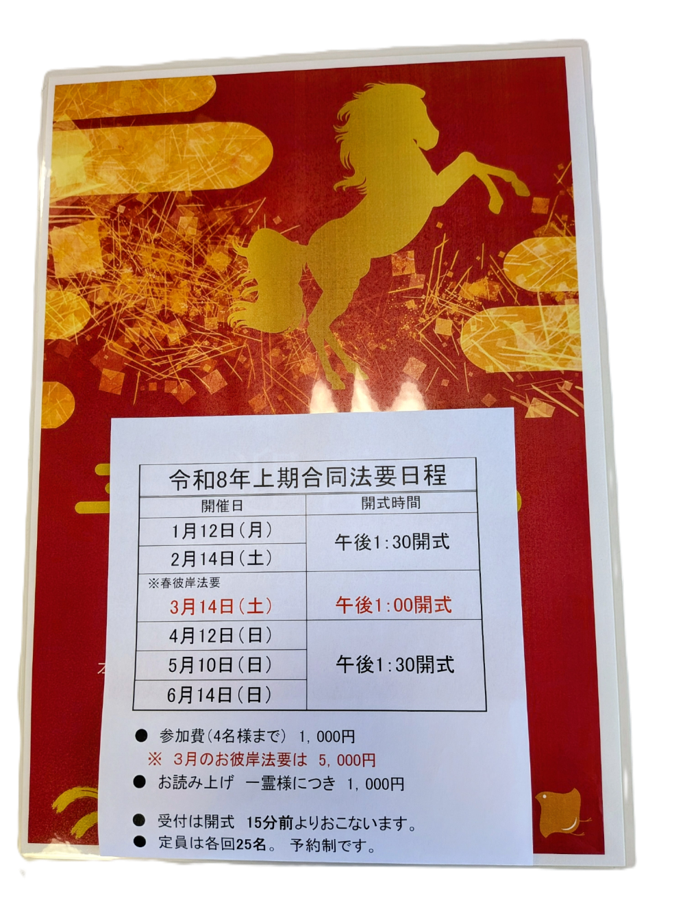 合同法要スケジュール 2026 上期 平素より当霊苑をご利用いただき、誠にありがとうございます。 2026年に執り行う合同法要の上期スケジュールが決まりましたのでご案内いたします。 合同法要は、ご先祖様や大切な方へ感謝の気持ちをお伝えする、心静かなひとときです。ご家族皆さまで手を合わせていただける機会として、多くの方にご参列いただいております。 来年もスケジュールをご確認いただき、ご都合わせて是非ご参加ください。 横浜三保寺浄苑管理事務所 045-924-2105(要予約)