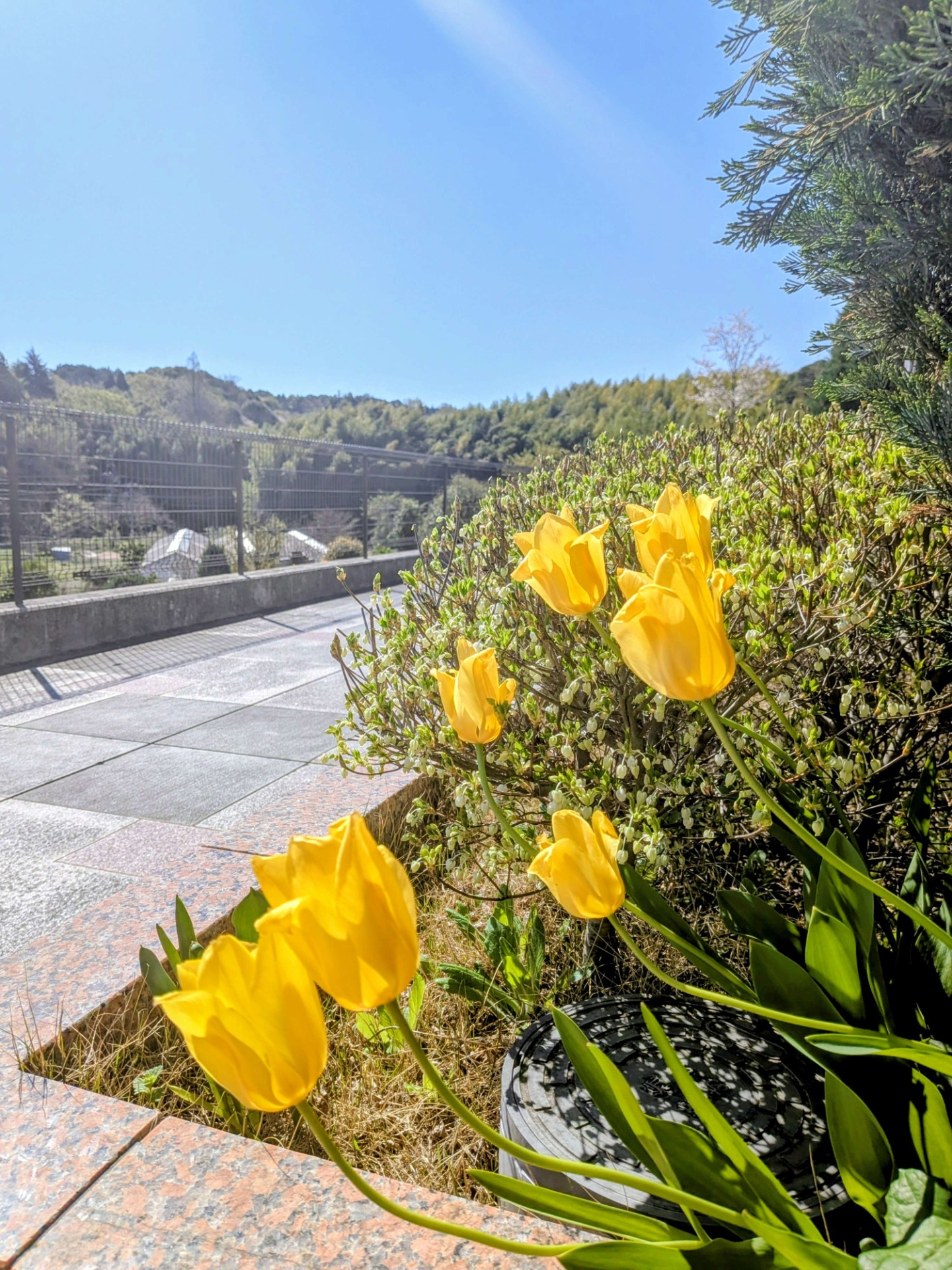 苑内では、青空の下でチューリップが元気に咲き、訪れる方々の目を楽しませてくれています。
