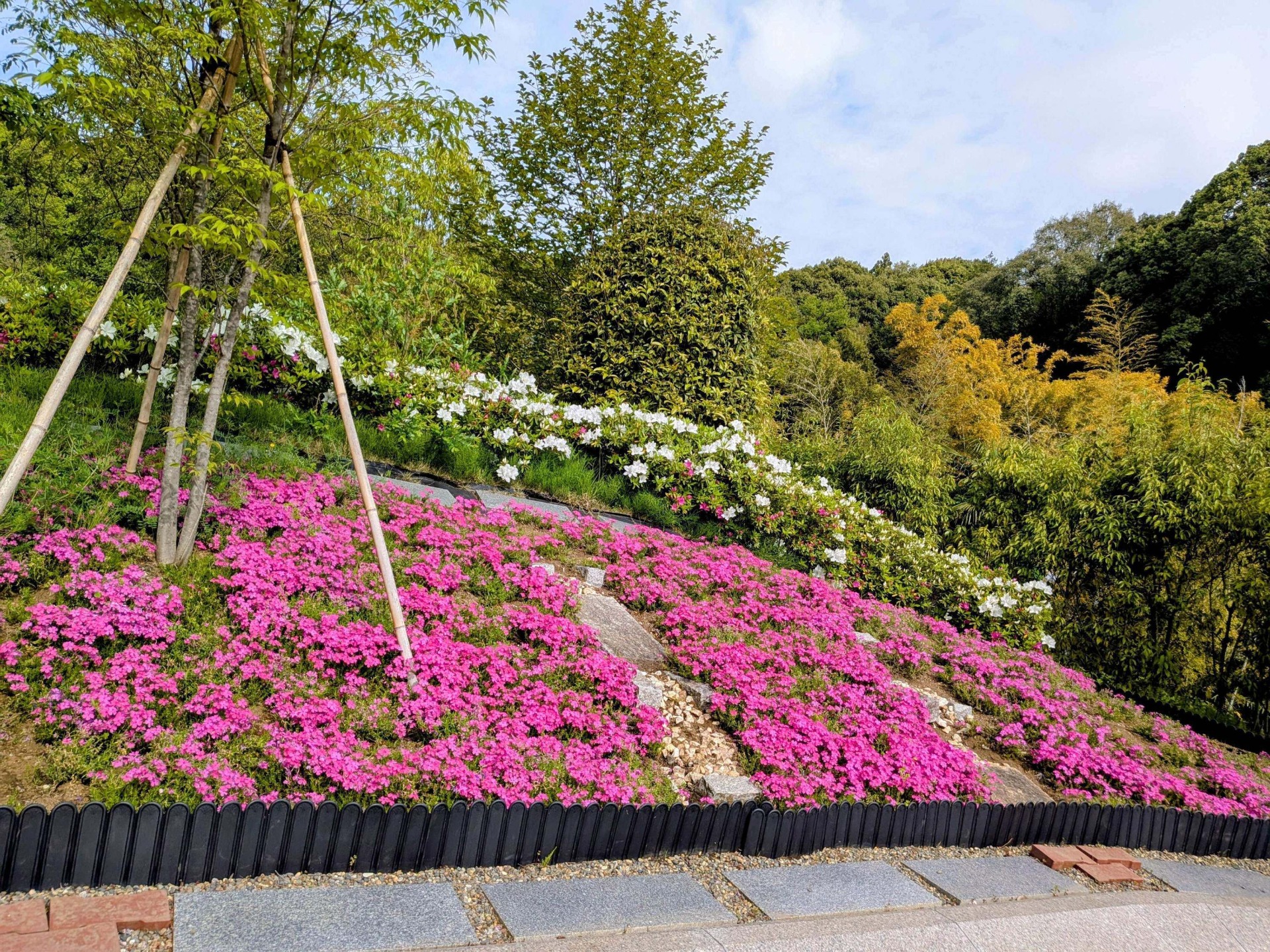背景にはつつじの植栽が色づき始め、芝さくらの柔らかな彩りに、より深みのある春の表情を添えてくれています。 斜面の花々と奥に広がる緑が重なり合い、苑内には穏やかな季節の移ろいが感じられるようになりました。